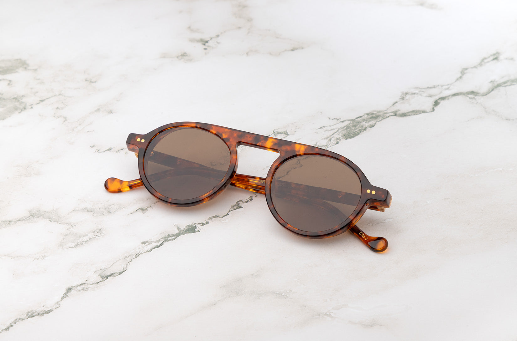 Peter Frank's design results from combining two different molds. The increasing thickness creates a nice detail under the temples and helps to shield the eyes. The well-defined caps, with our unique meandros, decorate the sunglasses.